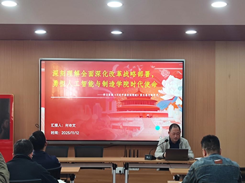11月12日下午,人工智能与制造学院在综合楼207召开理论专题学习会,集中学习党的二十届四中全会精神及《习近平谈治国理政》第五卷核心内容。学院党委副书记、院长何奇文领学,全体教职工参会。