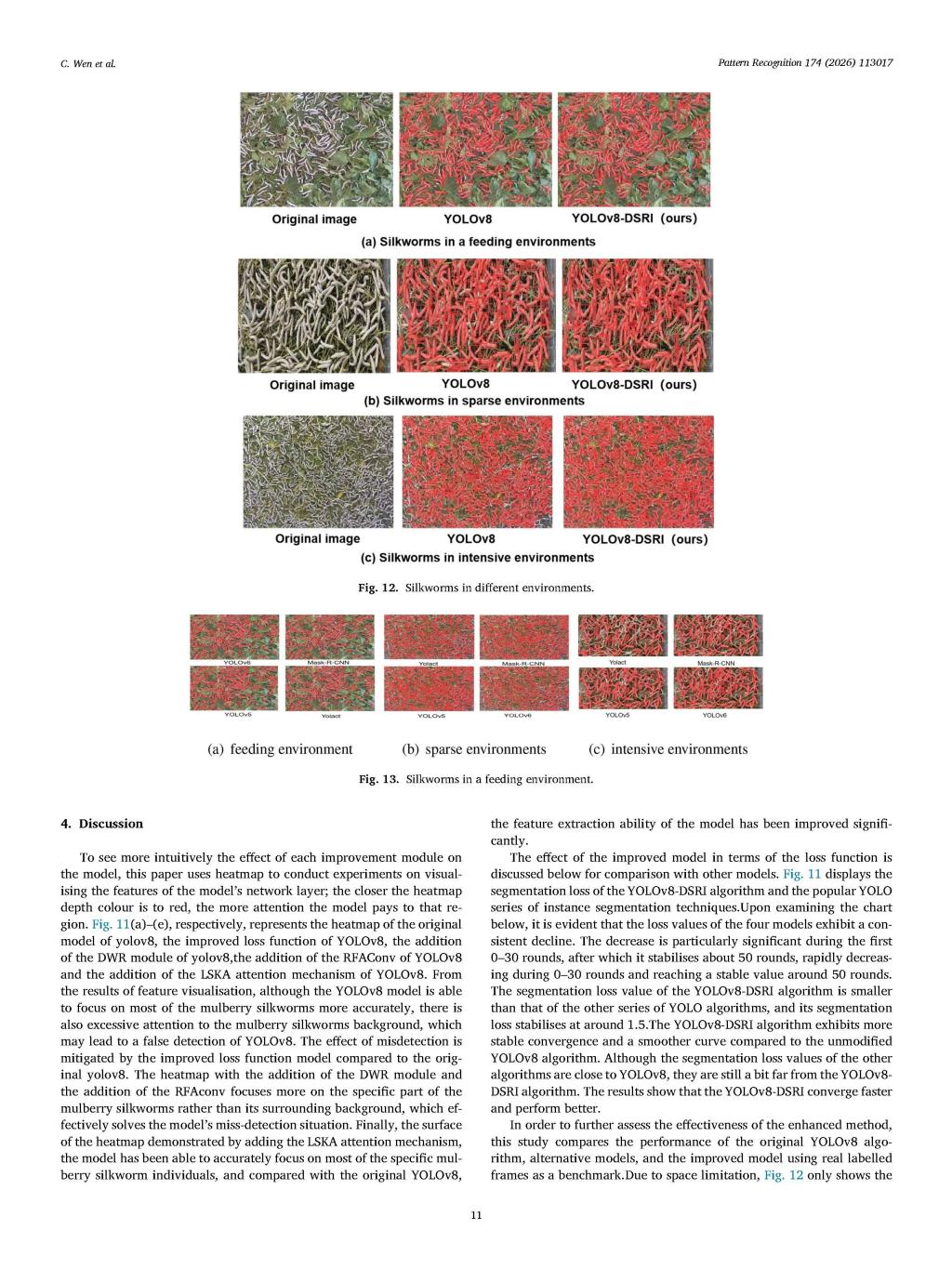 《Pattern Recognition》(中国科学院1区TOP,IF=7.6)自1968年创刊,历经50余年发展,已成为推动计算机视觉、图像处理、机器学习等模式识别相关领域进步的重要学术平台,被中国计算机学会列为人工智能领域B类国际期刊,在学术界影响力深远。传统桑蚕养殖里,蚕体分布密集、彼此遮挡,人工计数不仅效率低下且易出错。为攻克这一难题,研究团队创新性地提出密集目标实例分割算法YOLOv8-DSRI。该算法通过引入扩张残差模块、大分离核注意力机制、感受野注意力卷积以及更高效的损失函数,显著提升了模型在复杂密集场景下对蚕体目标的识别精度与稳定性,且保持了轻量化优势。该算法不仅能为智慧蚕桑赋能,还可为鱼苗、蔬果计数等农业场景下的密集生物检测提供有益参考。