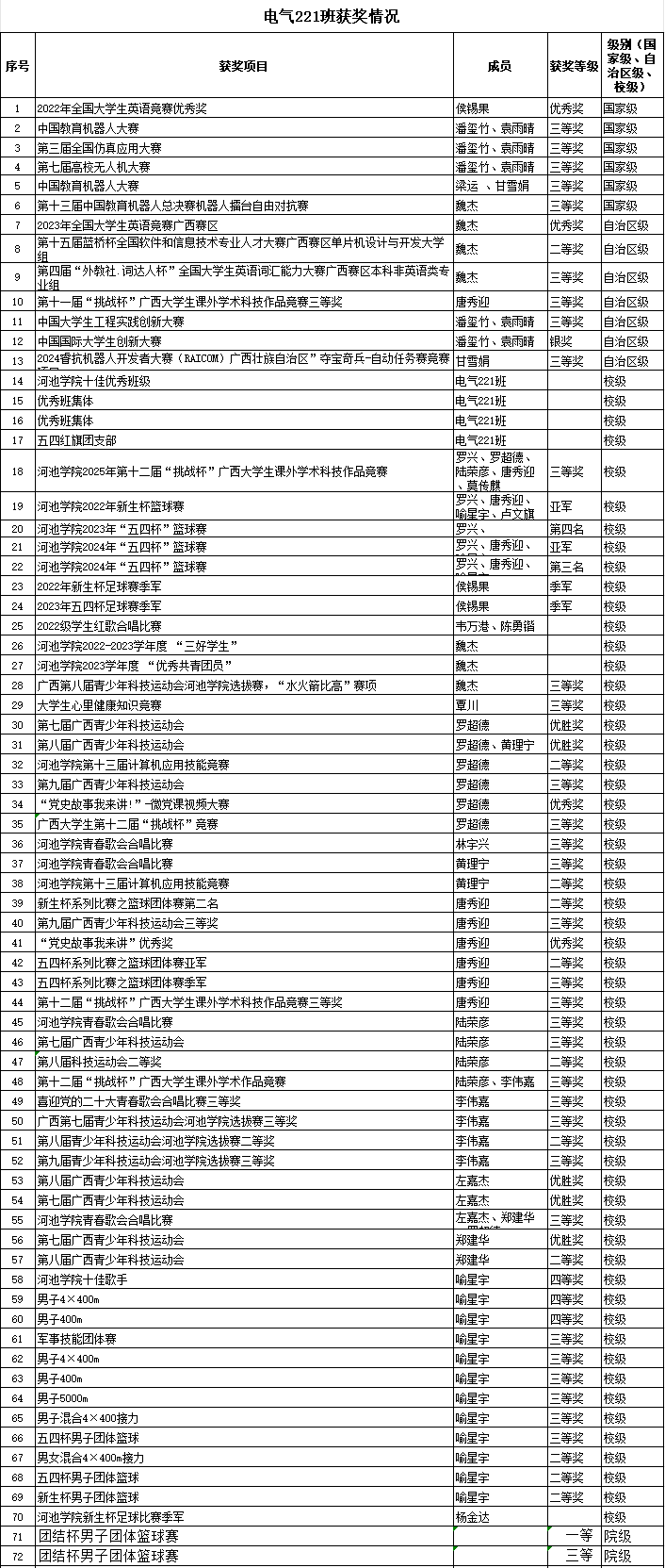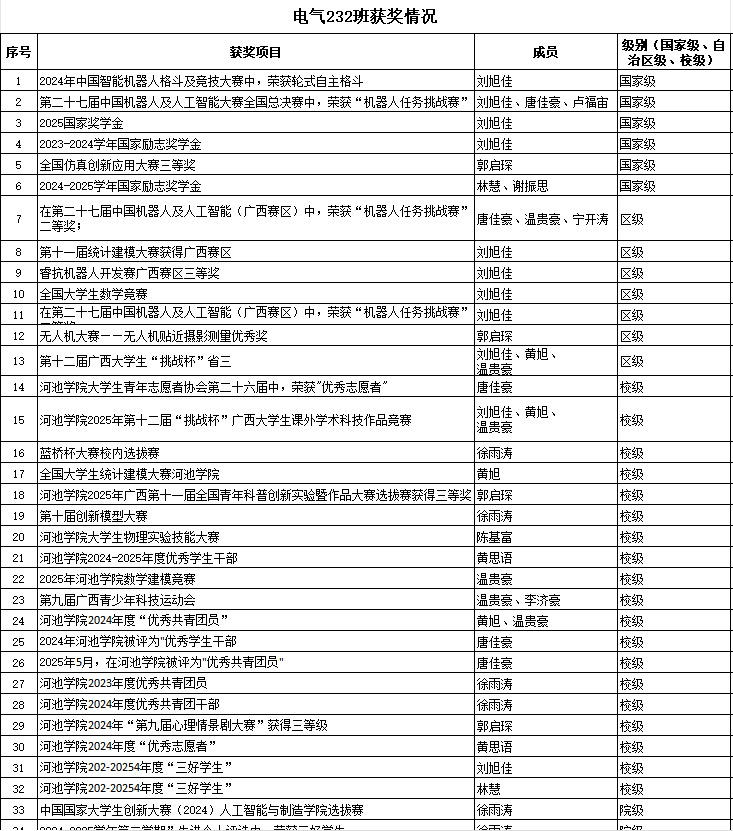 入学以来两班学子奋勇争先,斩获多项荣誉。电气221班累计斩获国家级荣誉6项、自治区级荣誉7项、校级荣誉42项,电气232班累计斩获国家级荣誉6项、自治区级荣誉7项、校级荣誉18项,覆盖学科竞赛、创新创业、社会实践等多个维度。两班班委自建立以来紧紧围绕思想引领、学风建设、综合素质提升定期策划并组织开展主题鲜明、内容丰富的活动,形成了“和谐融洽、互帮互助、奋发进取、追求卓越”的集体氛围,为班级整体发展提供了动力。