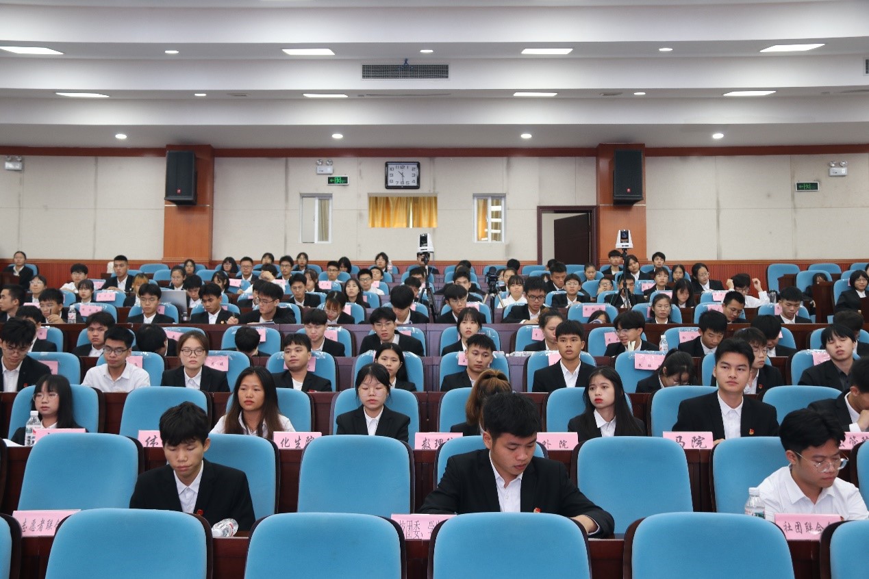 然后是院党委书记覃运初致辞,他指出我院学生会组织在院党委、校团委的领导下,紧密围绕学院中心工作,在各方面都取得了优异的成绩。希望大家能够继续发挥承上启下的作用,团结一致,共同奋进,要实事求是,踏踏实实地为学生服务,同时,继承和发扬光荣传统,用智慧和力量书写更加多彩的青春篇章!
