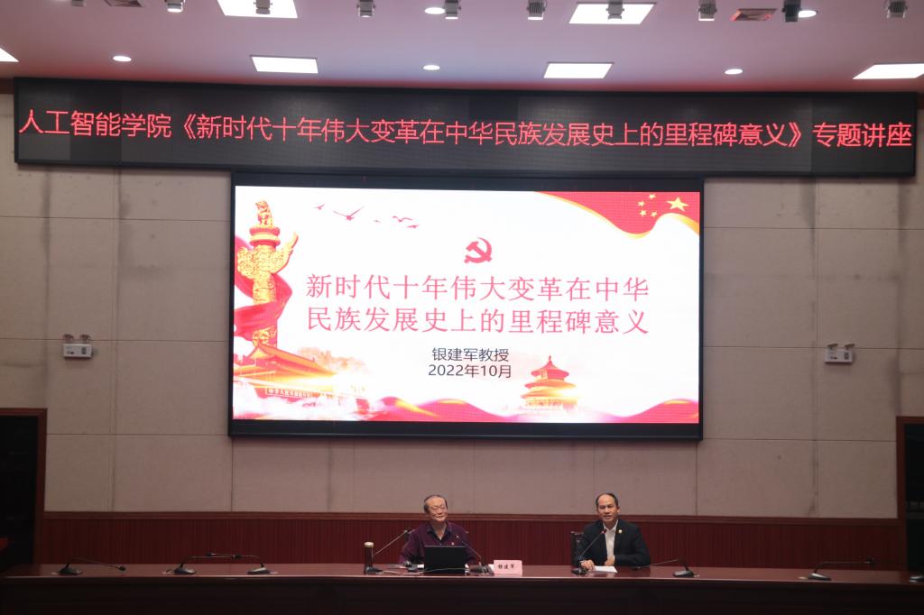 为全面深入学习和贯彻党的二十大精神,10月30日晚,我院邀请河池学院原党委书记银建军教授,在弘毅楼1-205会议室做《新时代十年伟大变革在中华民族发展史上的里程碑意义》专题讲座。我院党委韦晖书记主持,学院团委书记王联芳及2022级全体新生到场聆听。